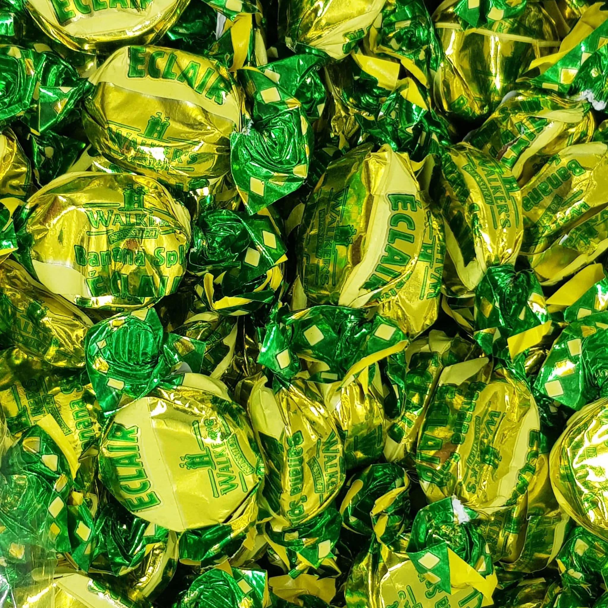 Banana flavoured creamy toffees with a white chocolate centreIngredients: Glucose Syrup (Derived from WHEAT), Sugar, Sweetened Condensed MILK, White Chocolate (Sugar, Whole MILK Powder, Cocoa Butter, Skimmed MILK Powder, Emulsifier (SOYA Lecithin), Natural Vanilla), Vegetable Oil (Palm Oil), Butter, Salt, Molasses, Emulsifier (E471), Flavourings.